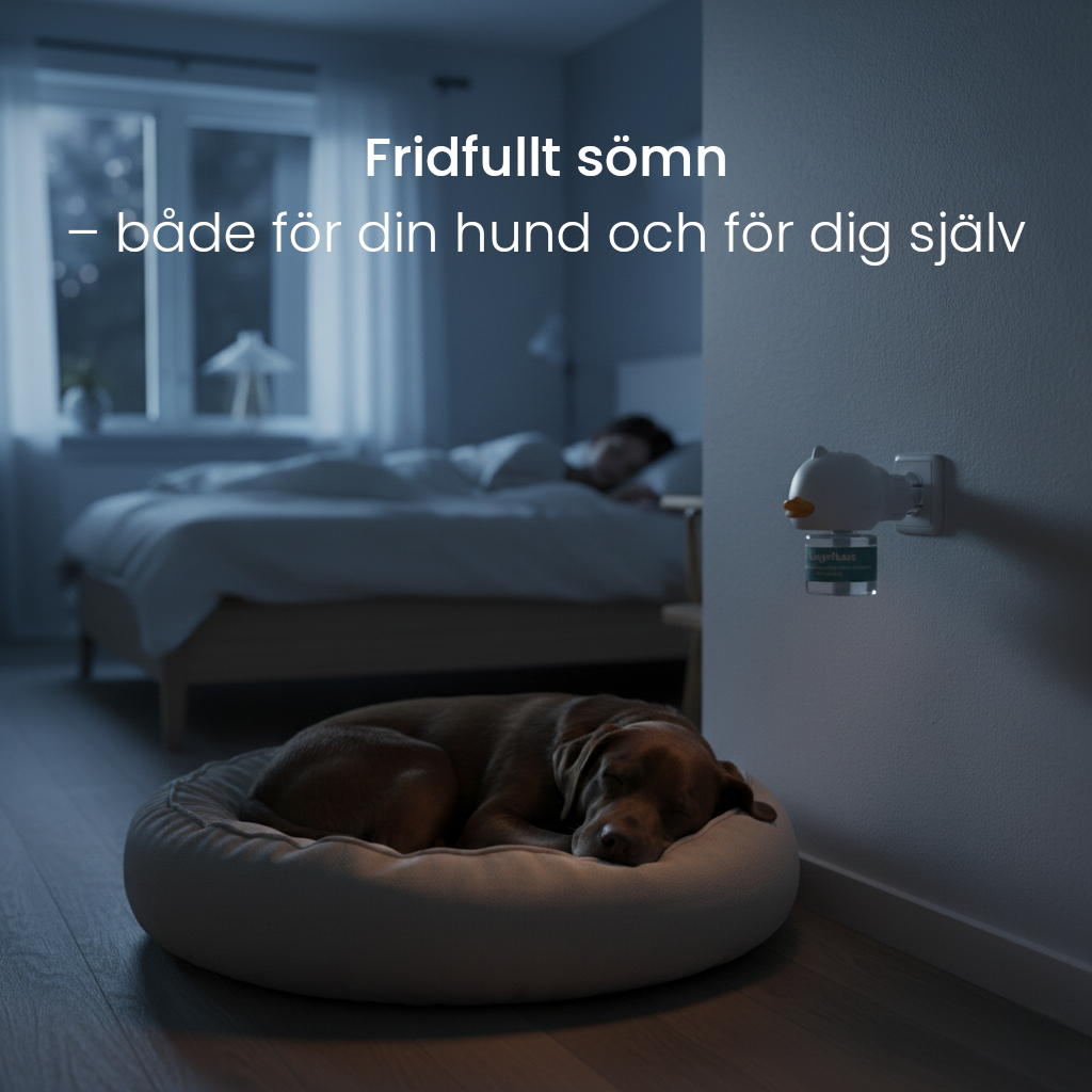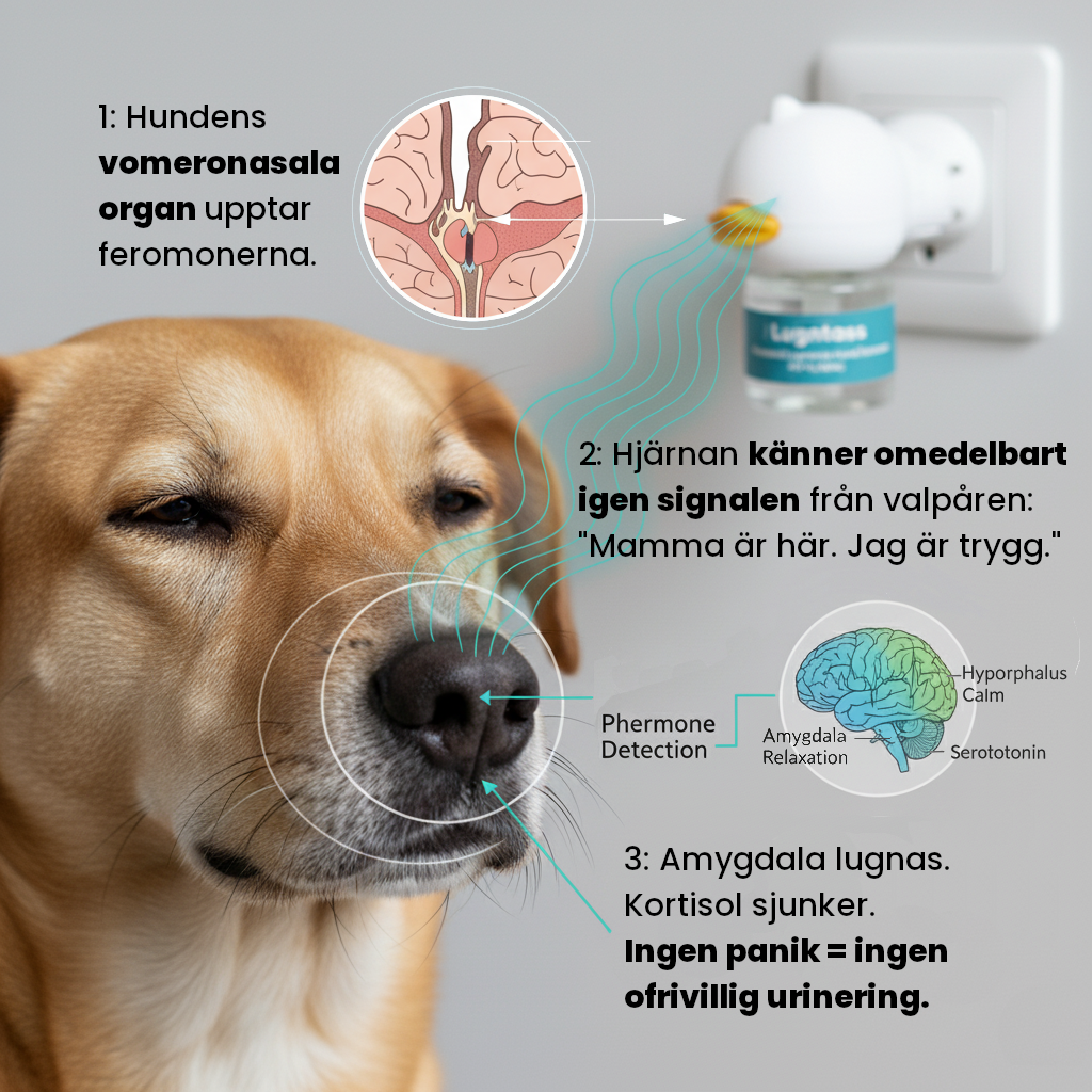 När du sätter in Lugntass™ i vägguttaget släpper apparaten ut artspecifika modersferomoner som triggar samma lugna, tryggande respons som hundar upplevde som valpar nära sina mammor. Detta återställer lugnet och minskar ångest på rot-nivå – inte bara symptomen.